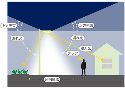 本来、屋外照明は、照らすべき範囲(照明領域)に光を照らすべきですが、その範囲を超えて照らしてしまうことが光害となります。