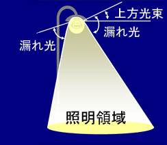 本来、屋外照明は、照らすべき範囲(照明領域)に光を照らすべきですが、その範囲を超えて照らしてしまうことが光害となります。